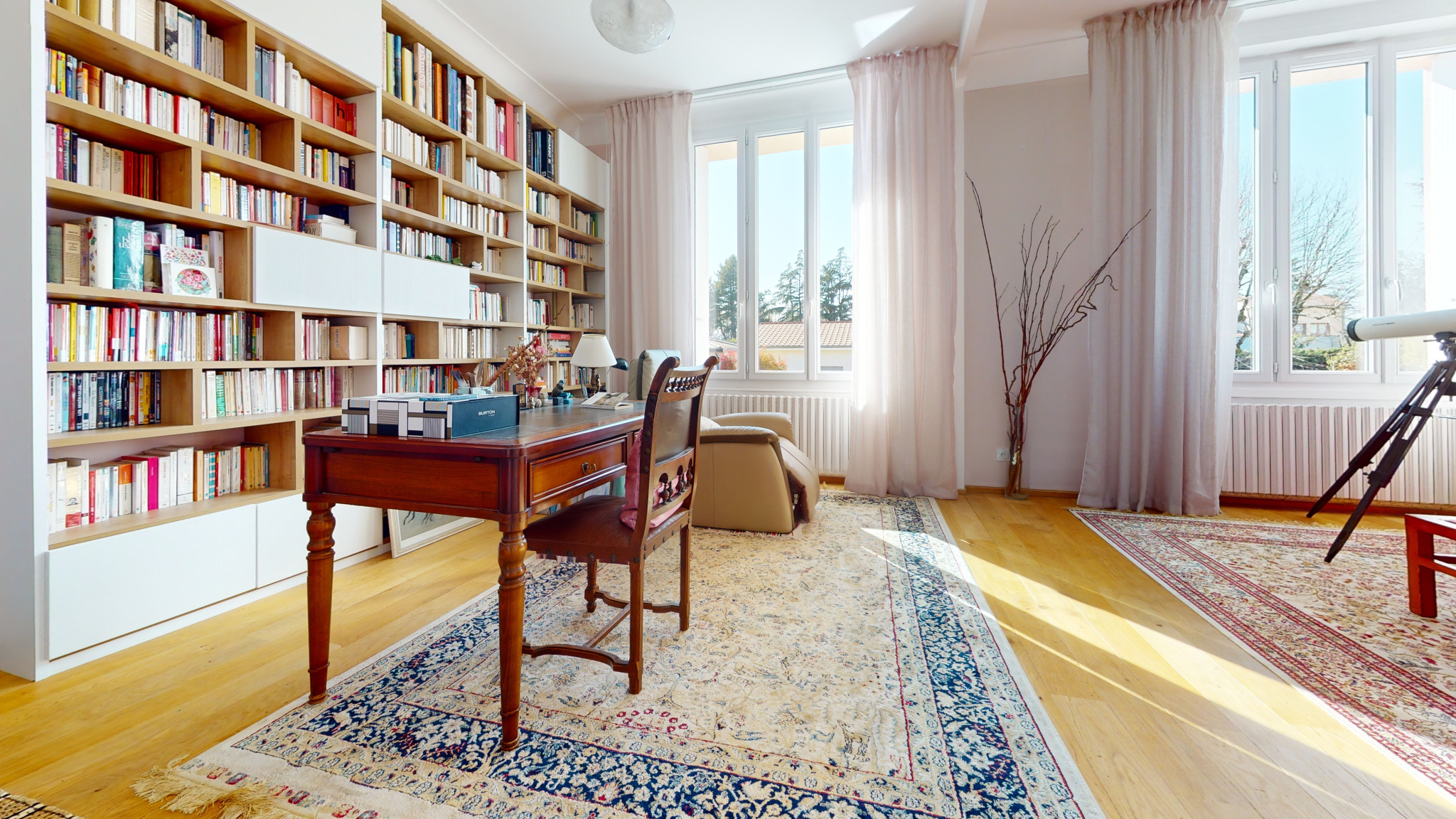 À l’étage, un grand espace actuellement aménagé en bibliothèque offre de nombreuses possibilités d’aménagement, ainsi que trois chambres et une seconde salle de bain.
