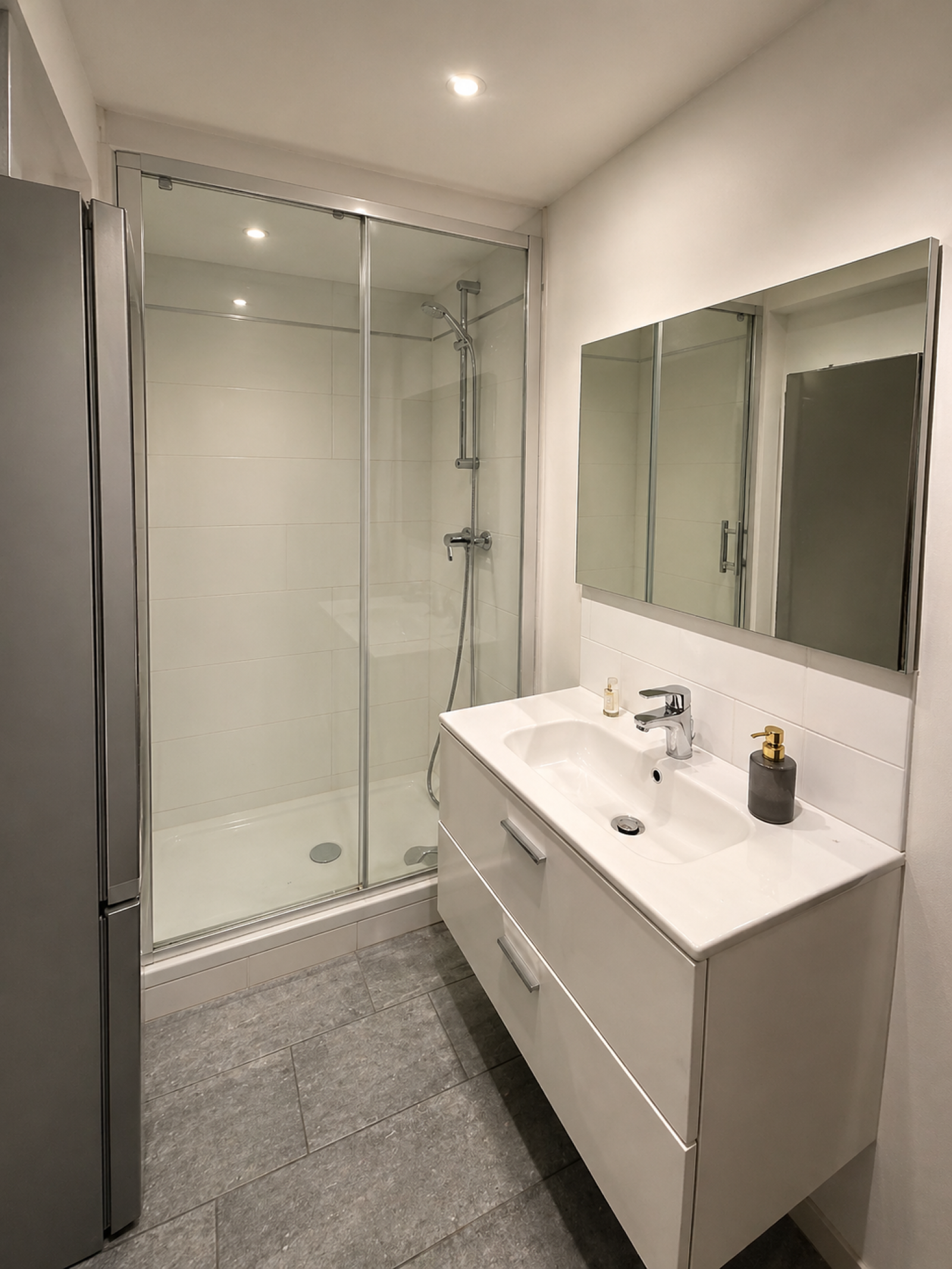L’appartement dispose de deux chambres, d’une salle de douche et de WC séparés.