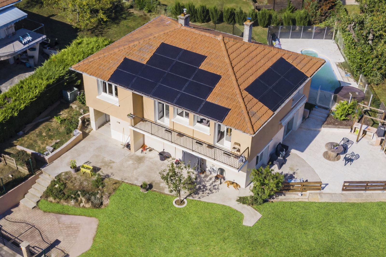 Parfaitement équipée pour votre confort, la maison dispose d’une pompe à chaleur, de panneaux photovoltaïques avec contrat de revente, d’un adoucisseur d’eau, d’un chauffe-eau de 300 litres et d’huisseries PVC double vitrage.