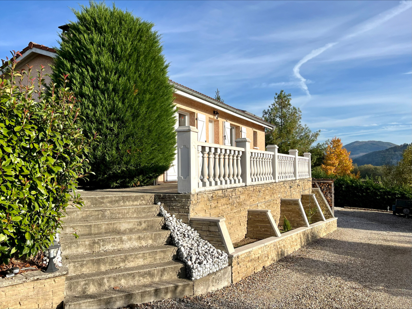 Jolie parcelle de 860m² clôturée et arborée, avec portail motorisé, pour abrité votre voiture la maison comporte un Carport pour acceuilir 2 voitures. Celle-ci possède deux terrasses, dont une exposé Sud-Est avec vue panoramique. Un carport et un terrain de pétanque viennent compléter ce bien.