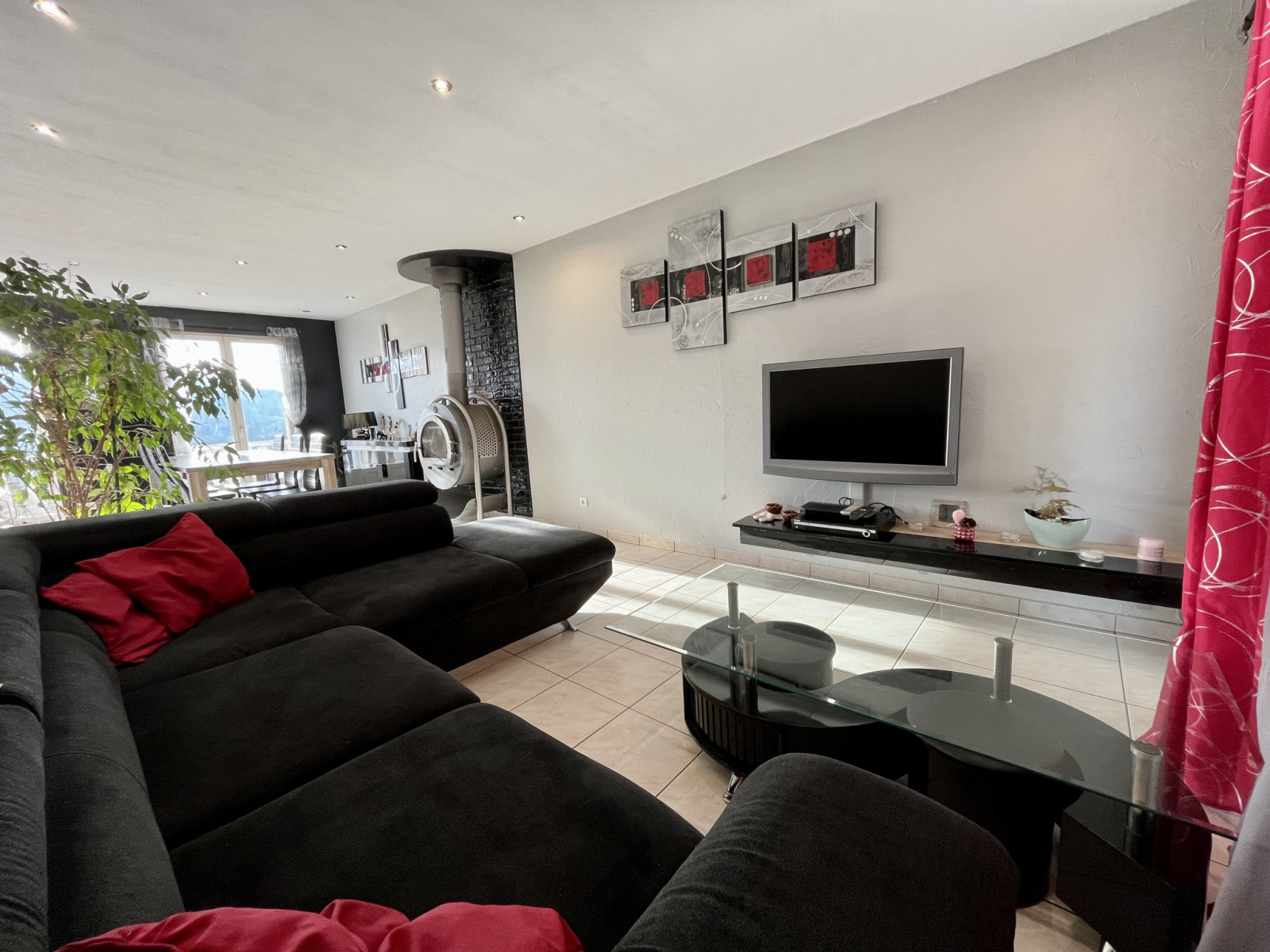 Cheminée poêle à bois ; chauffage au sol électrique et pompe a chaleur avec capteurs solaire. Maison relié au tout à l’égout.
