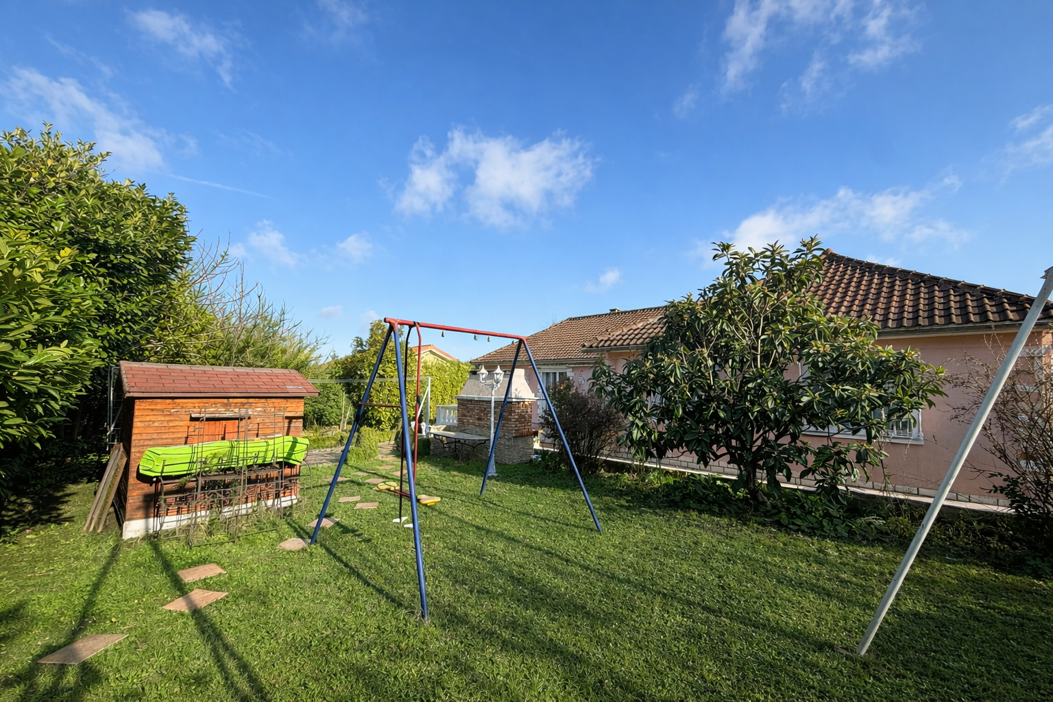 Le jardin est entièrement clos et paysager avec gout, avec deux grandes terrasses (une à l'Est pour le petit déjeuner et une à l'ouest pour vos soirées d'été) et d'un espace barbecue ainsi qu'une cabane de jardin de qualité. Possibilité d'installer une piscine.