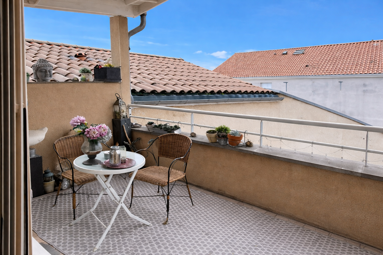 Il se compose d'une entrée avec rangements, donnant sur une pièce de vie très lumineuse avec espace cuisine entiièrement équipée, accès sur un balcon en dernier étage abrité, deux chambres dont une avec grand placard aménagé, salle de bains, wc séparé.